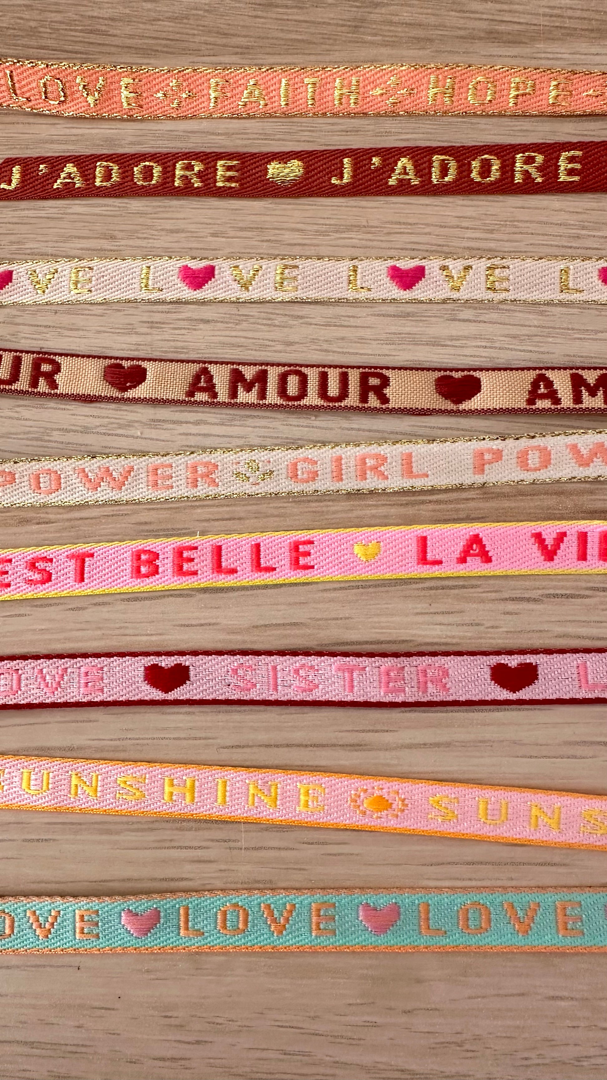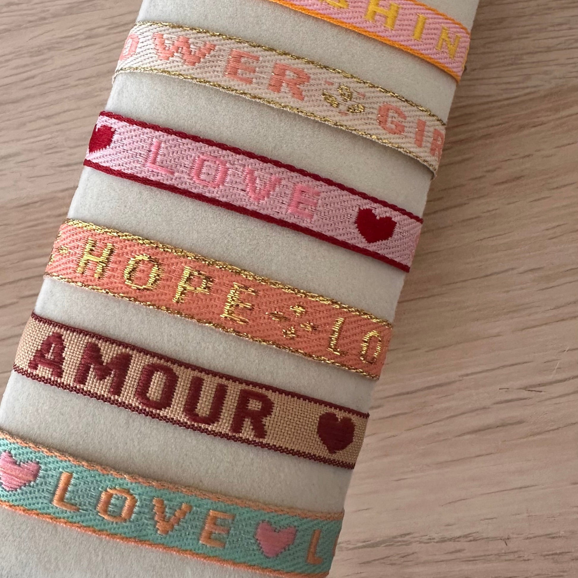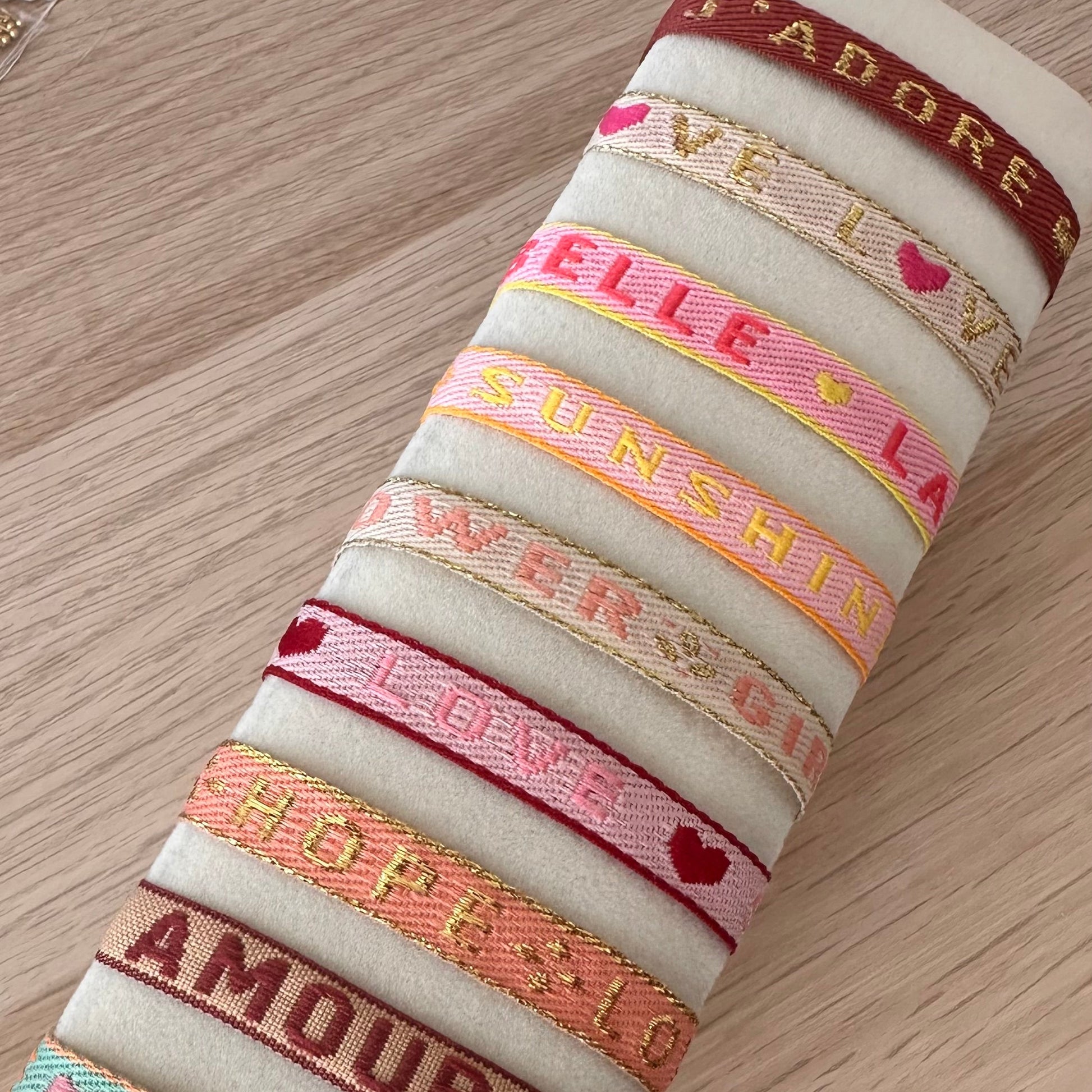 - Bracelet en ruban tissé coloré avec message